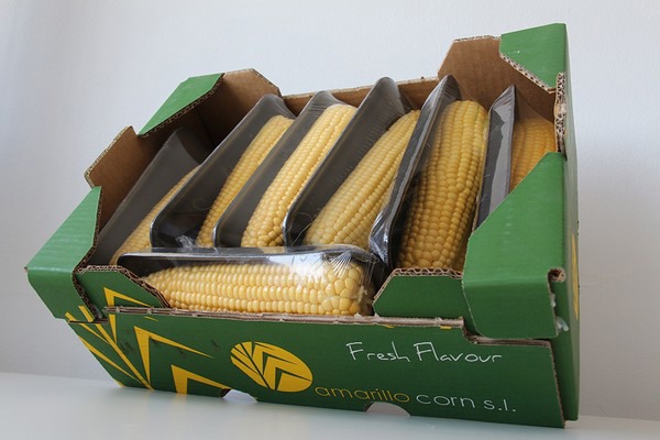Amarillo Corn envoie les épis de maïs doux non décortiqués et pré-refroidis de ses installations de Séville en vrac - des conditions qui favorisent leur durée de conservation - à ses principaux clients en Europe, bien qu'elle ait également développé une ligne de conditionnement final pour les supermarchés. « Nous sommes fournisseurs de Mercadona en Espagne et de certains supermarchés portugais, scandinaves et d'Europe de l'Est, où nous vendons du maïs épluché ou semi-épluché en barquettes de deux unités sous flow pack ou film étirable », selon les préférences de chaque client, ou des épis conditionnés en boîtes ou en caisses...