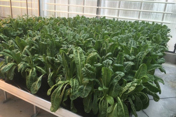 Plants de Cichorium dans la serre d'essai de l'ILVO. À partir des racines de ces plantes, les producteurs de chicorée font sortir les têtes blanches bien connues - et normalement amères - de l'endive.