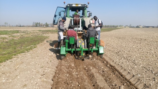 Une fois le sol préparé, les plants doivent être plantés au printemps dans un sol tempéré à une profondeur de 20 à 30 cm. La machine à transplanter nécessite quatre personnes à bord, dont deux pour préparer le matériel de pépinière et deux pour placer les plantes dans les emplacements appropriés, ainsi qu'un opérateur qui conduit le tracteur de 70 à 80 Hp. La machine est capable d'effectuer les opérations suivantes : ouverture du sillon, pose du tuyau de sous-irrigation, pose du porte-greffe en rangées simples ou doubles, et recouvrement du porte-greffe avec environ 10 à 15 cm de terre.