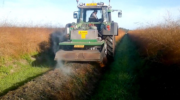 « Officine Mingozzi a mis au point un certain nombre de machines telles que la sarcleuse à flamme combinée à la coupeuse de mauvaises herbes, une machine qui permet à la fois le désherbage et la désinfection des rangs et le contrôle des mauvaises herbes pendant la phase de croissance des asperges. »