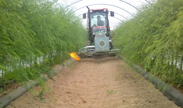 Le désherbage est l'un des principaux problèmes auxquels sont confrontés les producteurs d'asperges actuellement, avec la lutte contre les maladies fongiques. Une des pratiques recommandées après le fauchage de la végétation est de l'enlever et de la brûler. Le but de cette opération est l'élimination partielle ou totale des champignons pathogènes tels que le Stemfillium et la rouille, qui peuvent causer de graves dommages aux asperges. Le brûlage des résidus sur le sol permet également un excellent contrôle des graines de mauvaises herbes présentes à la surface du sol. Pour pallier le problème, il est possible d'utiliser des machines utilisant la chaleur produite par la combustion du GPL.