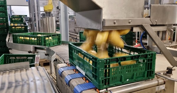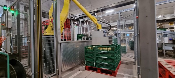 Moespom propose une autre option supplémentaire. Il s'agit de remplir les caisses pliantes de pommes de terre en vrac immédiatement après le dépliage. Les caisses pliantes remplies sont ensuite transportées directement vers le palettiseur de Lan Handling. Les caisses pliantes peuvent être placées dans deux quais à palettes sur des palettes de différentes tailles, qu'il s'agisse d'EURO ou de blocs de palettes. De cette manière, la ligne d'approvisionnement en caisses existante est utilisée de manière optimale.