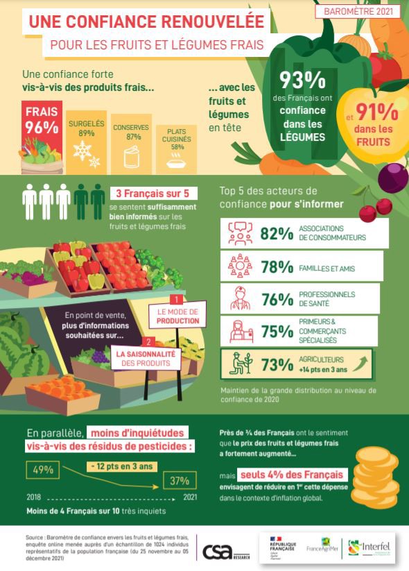 Les fruits et légumes frais arrivent toujours en tête de la confiance accordée aux produits frais, ex-aequo avec le pain. En 2021, 93 % des Français indiquent avoir confiance dans les légumes et 91 % dans les fruits ; des scores stables par rapport à 2020. Après le regain de confiance enregistré en 2019 (une progression de +4 pts vs. 2018),