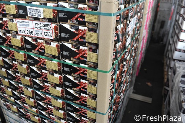 « Exportées pour le peuple de la République de Chine », peut-on lire sur une étiquette apposée sur une palette de cerises chiliennes sur le marché de Shanghai (photo de Riciputi, 24/11/2017)