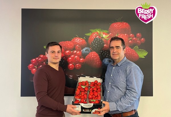 Daan De Keyser (BelOrta) et Johan Van Alphen (Special Fruit) présentent les premières fraises de 2022 de BelOrta.