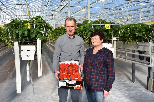 Les producteurs BelOrta, Lieven et Martine, avec les premières fraises de cette saison.