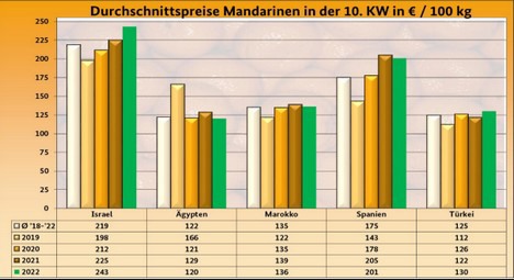 La saison des mandarines et des clémentines touche lentement à sa fin : l'intérêt et l'offre étaient limités, selon BLE. De plus, le temps plutôt ensoleillé et chaud n'a pas contribué à l'achat de mandarines. Cette situation mitigée a nécessité des aliments bien dosés pour défendre la demande toujours élevée. Les mandarines ont été dominées par les envois d'Espagne et d'Israël. Les variétés tardives, telles que Tang Gold et Nadorcott, ainsi que de plus petites quantités d'Orri ont été fournies par les producteurs espagnols, et les Orris uniquement par Israël.