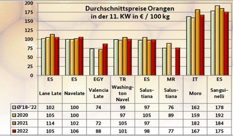Les oranges sanguines étaient principalement des Moro italiennes et des Sanguinelli espagnoles, dont la coloration actuelle et la teneur en jus étaient convaincantes. Les Tarocco d'Italie ont continué à perdre de l'importance ; vers le milieu de la semaine, elles ont complètement disparu à Munich.