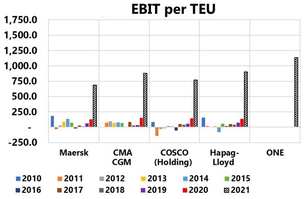 En moyenne, ces six compagnies maritimes ont réalisé un bénéfice d'exploitation de 861 dollars/TEU. Pour mettre les choses en perspective, au cours de la dernière décennie, l'EBIT/TEU moyen le plus élevé de ces compagnies maritimes mondiales était de 155 dollars/TEU, et c'était en 2010.