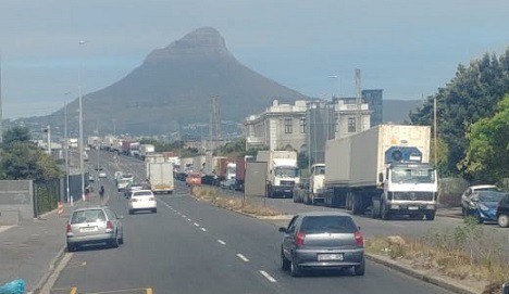 Une longue file de camions à Salt River transportant des fruits vers le terminal à conteneurs du Cap. Ils attendront probablement plusieurs jours avant d'être chargés.