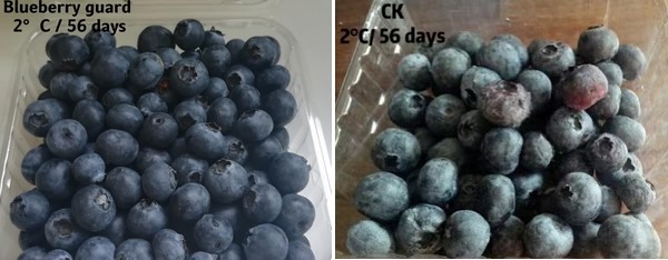 Dans cette expérience, les myrtilles ont été conservées à 2°C pendant 56 jours. L'un des contenants de myrtilles (à gauche) comprenait un sachet Log Fresh, et l'autre (à droite) était conservé dans un emballage ordinaire.