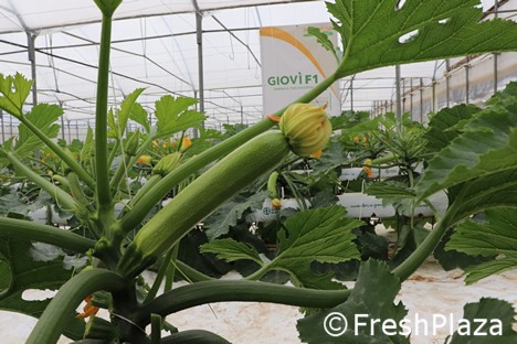 La serre d’exposition était entièrement consacrée à la courgette vert clair Giovì F1. La variété est caractérisée par des plants rustiques et vigoureux, bien ouverts, ce qui permet de localiser facilement les fruits lors de la récolte. Une autre caractéristique importante est les entre-nœuds courts et réguliers. Elle possède aussi une bonne adaptabilité aux cycles longs et ses fruits sont cylindriques.
