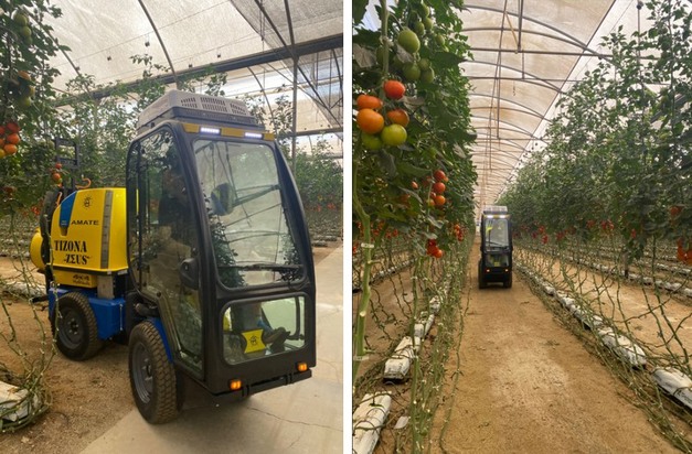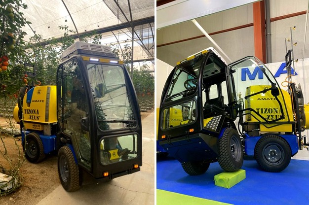 Elle roule dans les serres, est équipée de la climatisation, d'une radio mp4 et d'un nouveau système d'articulation lui permettant de tourner dans les espaces restreints. Et plus important encore : elle aide les producteurs à protéger leurs cultures sous plastique tout en protégeant l'opérateur de la machine. Il s'agit de la Tizona Zeus, une nouvelle machine de serre conçue par la société espagnole Carretillas Amate.