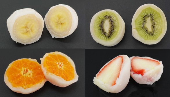 Comme son nom l'indique, les Daifuku aux fruits sont composés de différents types de fruits, tels que la mandarine, la pomme, le kiwi, l'ananas, la mangue, enveloppés dans la pâte de haricot.