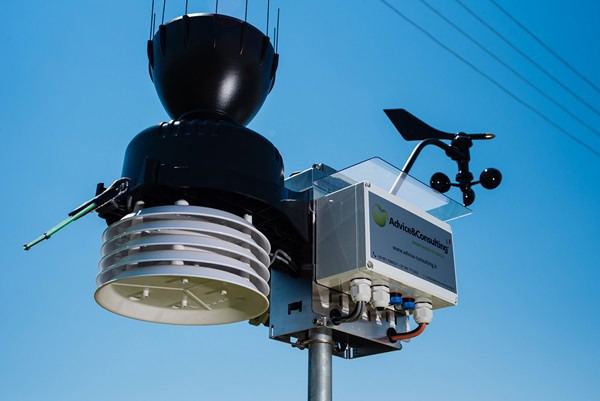 - Station météo GPRS complète avec un pluviomètre pour détecter la quantité et l'intensité de la pluie, un anémomètre pour mesurer la vitesse et la direction du vent, un capteur de température/humidité de l'air, un capteur de pression atmosphérique, un capteur externe de mouillage des feuilles et un capteur de rayonnement solaire et de lumière ;