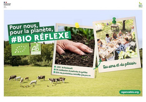 Si 94 % des Français déclarent connaitre le label AB et lui font largement confiance (91 %), 1 Français sur 2 estime ne pas avoir suffisamment d’informations sur le bio. Face à ce constat, l’équipe de France du bio, lancée le 3 mars dernier au Salon International de l’Agriculture et composée de l’Agence BIO, des interprofessions (Cniel, Cnipt, Cnpo, Inter api, Interbev, Intercéréales, Interfel, Synalaf, Terres Univia) et La Maison de la Bio, a lancé le 30 mai la première campagne d’envergure à destination du grand public pour faire du bio un nouveau réflexe dans le quotidien des Français.