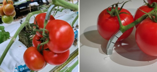 À droite : avec le système TOM, un anneau métallique est placé autour de la plante, une alternative à la torsion ou aux clips en plastique.