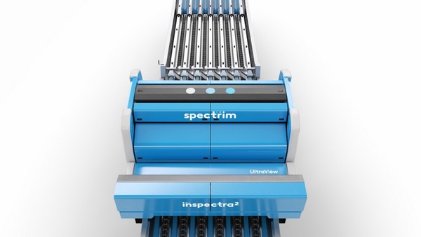 « Le module d'inspection UltraView s'intègre à Spectrim pour porter son pouvoir de vision à un niveau supérieur. Grâce à un ensemble dédié de caméras multi-spectrales (couleur et infrarouge) à haute résolution et de lumières LED situées idéalement près du fruit et parallèlement à sa direction de déplacement. UltraView peut identifier des défauts qui sont autrement difficiles ou impossibles à détecter dans la région de la coupe et de l'extrémité du fruit. »