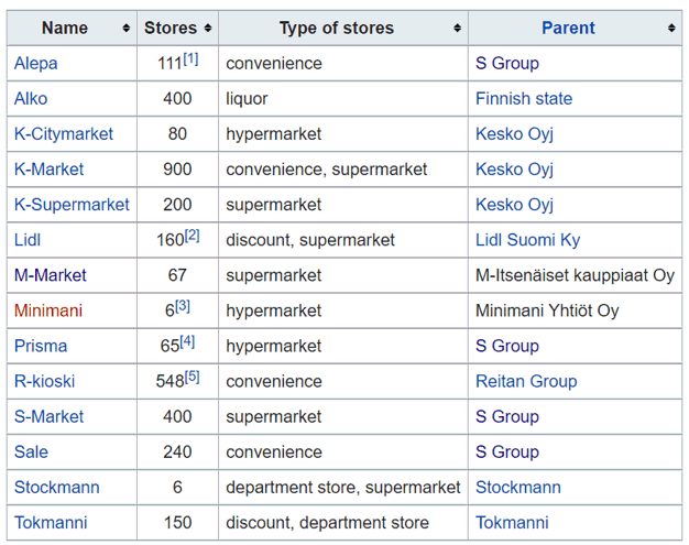 Deux groupes de distribution, S Group et K Group, dirigent le secteur de la distribution alimentaire en Finlande. En 2020, S Group détient la plus grande part de marché avec environ 46 % du commerce de détail alimentaire finlandais. Le groupe K, également connu sous le nom de Kesko, détient une part d'environ 36,9 %. Lidl est le troisième acteur le plus important du secteur de la distribution alimentaire en Finlande. Cette chaîne allemande de supermarchés à prix réduits est entrée sur le marché finlandais de la vente au détail au début des années 2000 et, en 2020, elle avait réussi à acquérir près d'un dixième de la surface des magasins de détail finlandais.