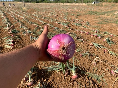 « Les oignons récoltés jusqu'à présent ont un poids moyen d'environ 400-450 g, avec un poids maximum de 900 g. Les cycles d'irrigation fréquents pendant les phases de croissance et de maturation nous ont permis d'éviter ce qui s'est passé l'année dernière, lorsque le calibre a été réduit de près de 50 % en raison de la sécheresse prolongée. »