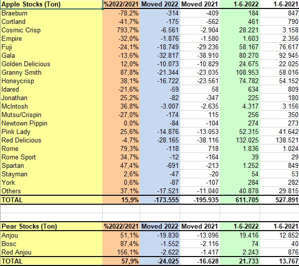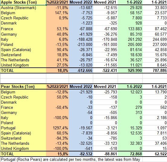 La WAPA collecte chaque mois les chiffres des stocks de pommes et de poires en Europe et aux États-Unis. La WAPA peut révéler que les stocks européens de pommes s'élevaient à 929 990 T au 1er juin 2022, soit 18 % de plus que le chiffre de 2021. Cette tendance s'explique par les augmentations concernant la Jonagold (49,7 % par rapport à 2021), la Red Jonaprince (+49,4 %), la Gala (+39,4 %) et la Golden Delicious (+24,3 %), bien que plusieurs variétés aient enregistré une baisse par rapport à 2021, notamment la Gloster (-84,9 %) et l'Idared (-17,4 %). D'autre part, les stocks de poires s'élevaient à 72 868 T au 1er juin 2022, soit 15,8% de plus que le volume de 2021. L'augmentation par rapport à 2021 est presque exclusivement imputable aux poires Rocha du Portugal, qui ont augmenté de 15 329 T.