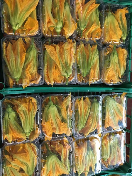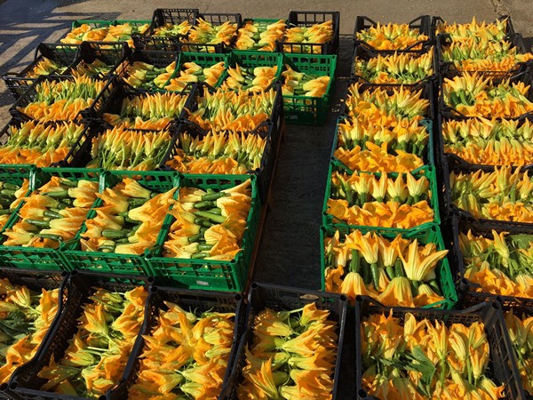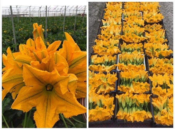 « La récolte a lieu de 5 h 30 à 8 h du matin. Les fleurs sont immédiatement humidifiées avec un spray diffus, recouvertes d'un chiffon humide, puis placées dans une chambre froide à une température de 2-3 °C avant de partir pour leur destination. La courgette est une espèce monoïque. Cela signifie que la même plante a à la fois des fleurs femelles (qui produiront le fruit) et des fleurs mâles. La fioretta, ou fleur mâle, est utilisée en cuisine pour préparer divers plats. Un autre produit qui se porte bien est la fleur de courgette, la fleur femelle avec un fruit attaché. »
