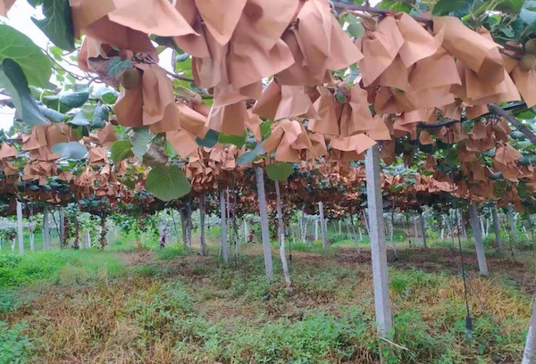 Les propriétaires de vergers couvrent les kiwis dans des sacs en papier pour protéger les fruits du fort ensoleillement et des vents violents. Cela permet de protéger le kiwi contre les dommages, mais aussi de garder la peau du fruit intacte.