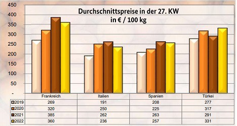 Les livraisons espagnoles ont dominé, plus que les livraisons italiennes. Les livraisons françaises ont complété le tableau, ainsi que les livraisons grecques dans une moindre mesure. La demande a été sensiblement réduite en raison des conditions climatiques et des vacances. Les prix ont souvent été orientés à la baisse, ce qui dans certains cas a quelque peu relancé la commercialisation.