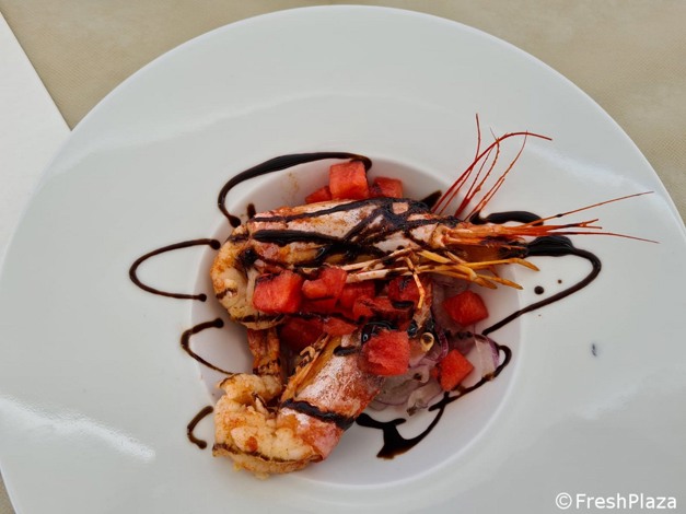 Le chef Mauro Spadoni a prouvé avec son menu à Bagno Prey que cette pastèque se prête bien à diverses utilisations en cuisine. Ce n'est pas un hasard si cette présentation a lieu dans la province de Ferrare, une région particulièrement adaptée à la culture de la pastèque. « Spadoni a exalté le potentiel de la pastèque à peau noire en intégrant le fruit dans tous les plats d'un menu, de l'entrée au dessert », a déclaré M. Colombi.