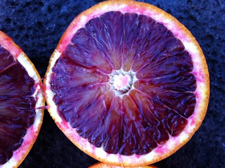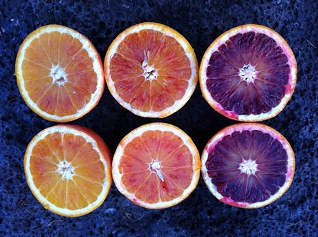 Comparaison entre les oranges Tarocco. De gauche à droite : Tarocco nucellaire, Tarocco commune, et Tarocco Vigo (photo prise à la mi-janvier)