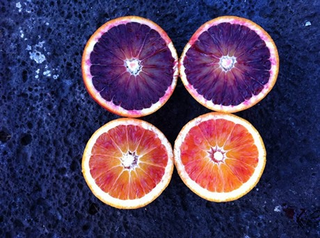 Comparaison entre les oranges Tarocco. De gauche à droite : Tarocco nucellaire, Tarocco commune, et Tarocco Vigo (photo prise à la mi-janvier)