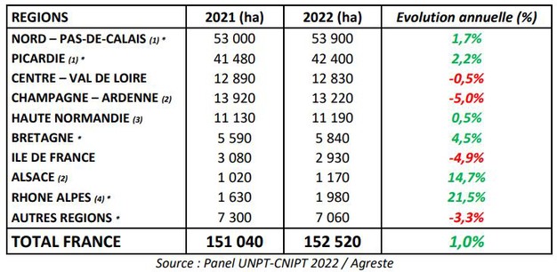 In detail hebben de meest significante oppervlaktetoenames betrekking op de regio Hauts-de-France (Nord-Pas-de-Calais en Picardië) met +1.820 ha en worden verklaard door de zeer sterke vraag van