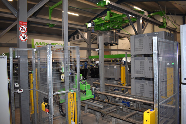 La zone de triage de l'installation de Van Putten est remarquablement calme ; il n'y a personne autour. Les choux de Bruxelles y sont triés en fonction de leur taille, de leur forme et de leur qualité extérieure. Des robots empilent les caisses de choux de Bruxelles par trois, puis les enlèvent automatiquement.