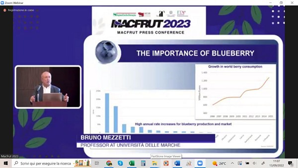Le fruit symbolique de Macfrut 2023 sera la myrtille, qui sera le protagoniste à la foire d'un événement mondial, les International Blueberry Days, consistant en trois jours avec les meilleurs experts techniques et scientifiques internationaux, ainsi que les principaux opérateurs mondiaux, dont l'américain Driscoll's, classé premier en pépinière et en production fruitière, et l'australien Costa Group, un important sélectionneur dans la production de myrtilles. Les visites sur le terrain et la formation sont coordonnées par Bruno Mezzetti de l'Université Polytechnique des Marches, en collaboration avec Thomas Drahorad de NCX Drahorad.