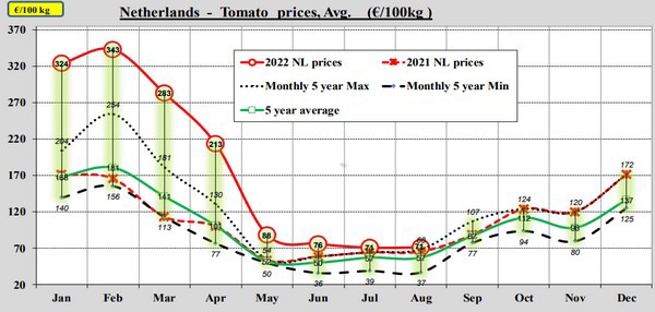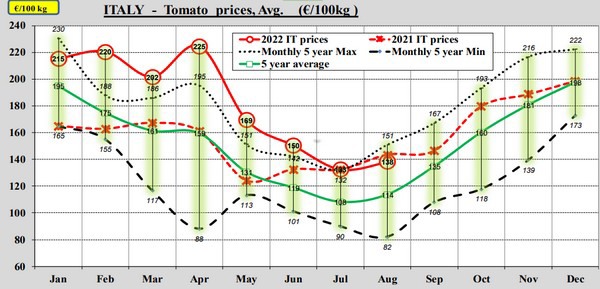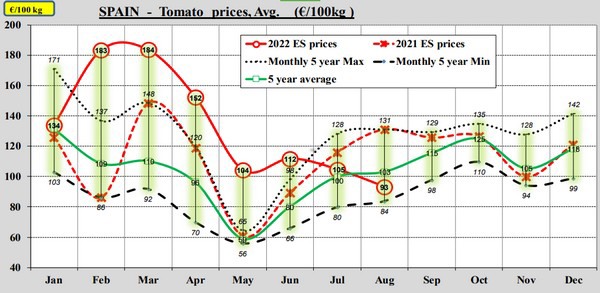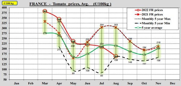Le tableau de bord de la CE pour les tomates montre qu'en août, les prix des tomates étaient à peu près égaux à la moyenne des cinq dernières années. Toutefois, contrairement à la tendance, les prix ont baissé en août.