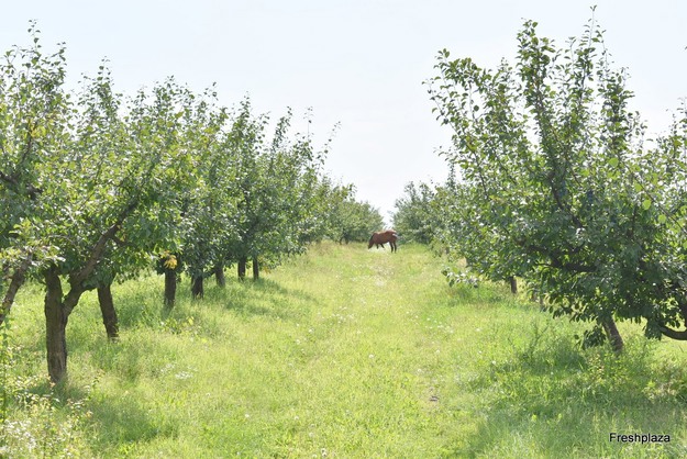Le cheval d'un employé pâture entre les arbres fruitiers.