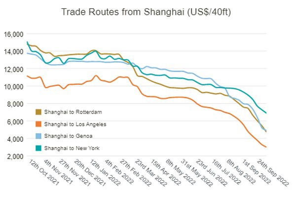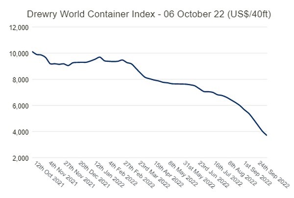 Les pertes de l'indice Drewry's World Container Index (WCI) continuent de s'étendre. L'indice a perdu 8 % pour terminer à 3 688,75 $ US sur la semaine, prolongeant ainsi sa série de pertes hebdomadaires sur 32 semaines. L'indice a maintenant perdu 76 % de ses gains depuis les niveaux pré-pandémiques.