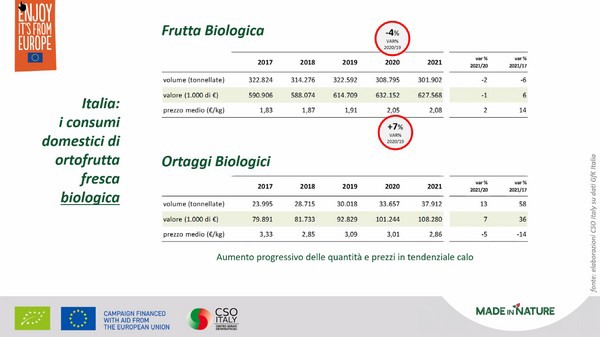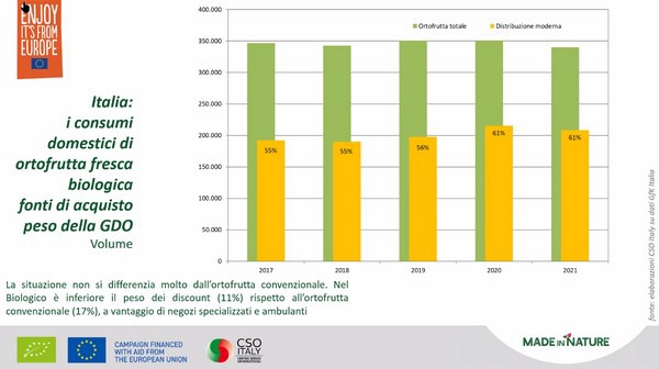 Enfin, Elisa Macchi a évoqué l'indice de pénétration et le volume d'achat moyen. « La consommation de produits biologiques a diminué en Italie au cours des deux dernières années, mais cette donnée n'est pas indiquée par l'indice de pénétration, c'est-à-dire que le nombre de familles qui achètent des produits biologiques au moins une fois par an n'a pas changé. C'est la consommation moyenne par famille qui a changé : de 20 kg en 2017 à 17 kg en 2021. »