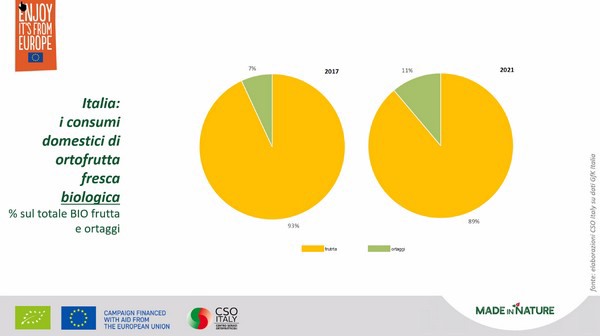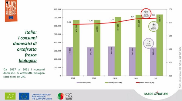 « La consommation de fruits biologiques atteint un peu plus de 300 mille tonnes, tandis que les légumes biologiques atteignent environ 38 000 tonnes. La tendance au fil des ans a été différente pour les deux catégories. En ce qui concerne les fruits, on observe une certaine stabilité entre 2017 et 2019, à l'exception d'une baisse en 2018, qui devient plus conséquente en 2020 et 2021. Quant aux légumes, bien qu'ils représentent une part plus faible, les ventes ont augmenté année après année : des presque 24 000 tonnes de 2017 aux presque 38 000 de 2021. »