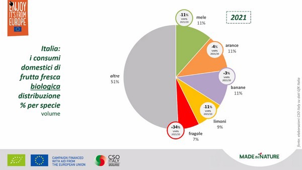 « Les fruits bio les plus populaires sont les pommes, les oranges, les bananes (11 % chacun), les citrons (9 %) et les fraises (7 %) qui, ensemble, représentent près de 50 % des achats de fruits bio dans notre pays. En 2021, les fraises et les bananes ont enregistré une augmentation de respectivement 34 et 3 % par rapport à 2020, alors qu'une baisse a été enregistrée pour les autres produits. »