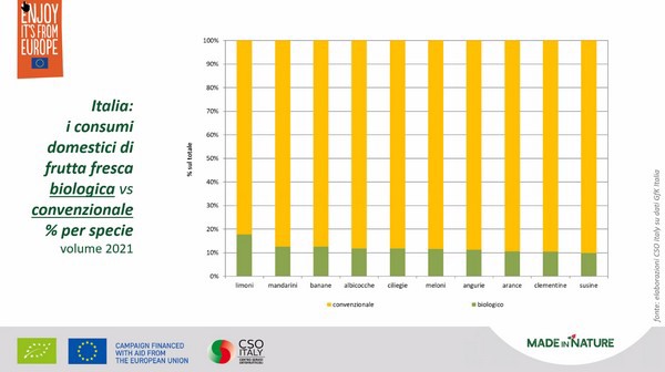 Si l'on considère la part du bio, la directrice du CSO Italie a souligné combien les dix produits considérés ne correspondent pas forcément à ceux du graphique ci-dessus. « Les citrons occupent la première place avec 20 %, suivis d'une série de produits comme les mandarines, les bananes, les abricots, les cerises, les melons et les pastèques, dont la part de produits biologiques dépasse 10 % du total. Les oranges, les clémentines et les prunes tournent autour de 10 % ».