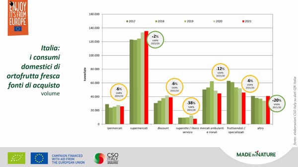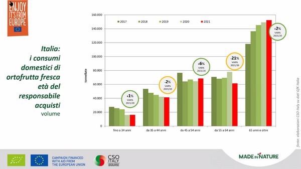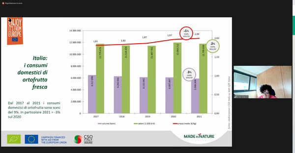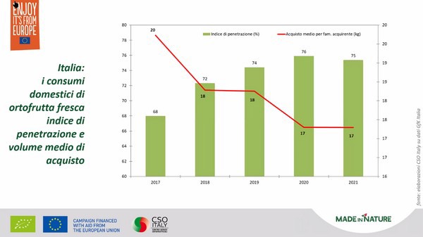 « Ce n'est pas une bonne période en ce qui concerne la consommation de produits frais en Italie : entre 2017 et 2021, la consommation a chuté de 9 %, soit de 6,5 à 5,9 millions de tonnes. En particulier, 2021 a enregistré une baisse de 3 % par rapport à 2020. Dans le même temps, le prix moyen au détail a augmenté », a rapporté Elisa Macchi, directrice du CSO Italie, lors du Digital Press Lunch de Made in Nature.