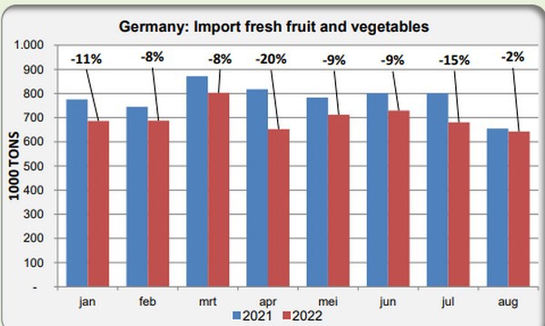En août 2022, l'Allemagne a importé « seulement » 2 % de fruits et légumes frais de moins qu'en août 2021. Tous les mois précédents, les baisses étaient beaucoup plus importantes. Dans l'ensemble, ces importations ont diminué de 10 % au cours des huit premiers mois de cette année, selon une analyse de Jan Kees Boon de Fruit & Vegetable Facts.