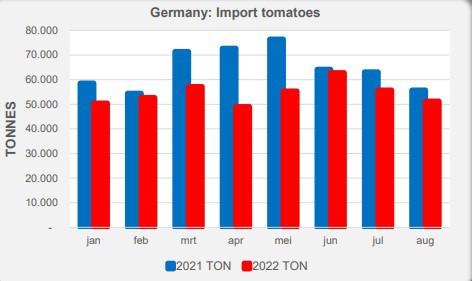 Après les bananes, les tomates sont le deuxième produit d'importation de fruits et légumes frais en Allemagne. En 2021, ce pays a importé 750 000 tonnes de tomates, dont 380 000 tonnes en provenance des Pays-Bas et 165 000 tonnes d'Espagne. Pour les Pays-Bas, les tomates (hors réexportation) sont de loin le produit d'exportation le plus important vers l'Allemagne.
