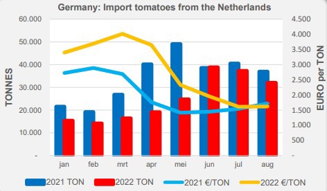 Les importations allemandes de tomates marocaines ont fortement augmenté au cours des huit premiers mois de cette année, passant de 32 000 à 46 000 tonnes, soit une hausse de 44 %. Le prix à l'importation (statistique) des tomates néerlandaises était beaucoup plus élevé (48 %), surtout au cours des six premiers mois, qu'un an auparavant. En juillet et août, le prix moyen à l'importation des tomates des Pays-Bas a atteint le même niveau que l'année dernière.