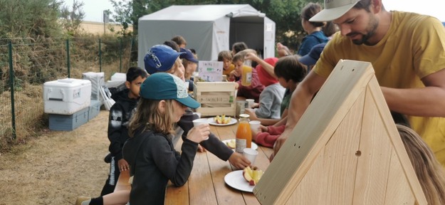 Journée d’atelier avec les enfants d’une des colonies Ekölo : les producteurs de swing sont venus animer des ateliers sur la biodiversité et les interactions entre les plantes et les insectes (juillet 2022)