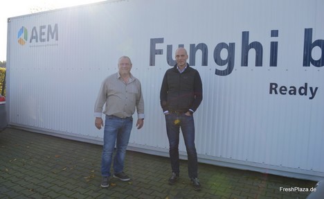 Theo Kempen et Peter Aerts devant la Funghi Box d'AEM qui est actuellement utilisée pour tester la qualité du substrat. Ce conteneur de culture conditionnée comporte plus de 160 blocs et reproduit fidèlement les conditions d’une cellule de croissance « à part entière »