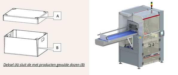 Lors du pliage manuel et de la pose du couvercle sur la boîte, un espace est délibérément laissé entre la boîte et le couvercle. Il est ainsi plus facile pour l'employé de placer le couvercle sur la boîte. La machine a besoin de moins de jeu entre la boîte et le couvercle. La réduction du jeu entre le couvercle et la boîte est un avantage supplémentaire important, car les couvercles restent mieux en place et les boîtes remplies tiennent plus fermement sur la palette.