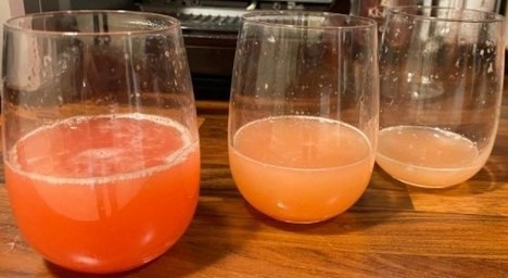 Le verre de gauche présente le jus du Red Premium, les autres verres sont ceux d'autres pomelos