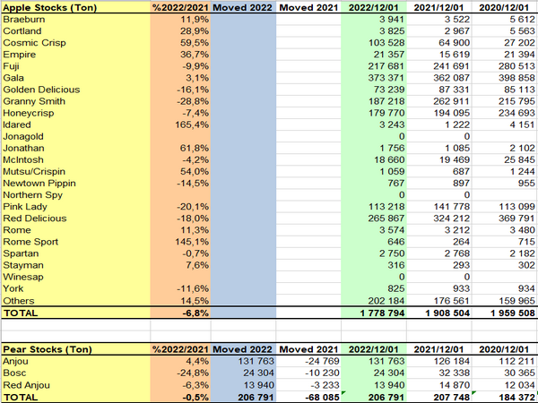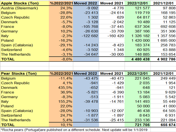 La WAPA peut révéler que les stocks européens de pommes s'élevaient à 4 480 438 T au 1er décembre 2022, soit une baisse de -8,6% par rapport à 2021. Cette tendance s'explique par la diminution de la Jonagold (-23,7 % par rapport à 2021), de la Jonagored (-25,2 %), de la Gala (-17,5 %) et de la Golden Delicious (-18,6 %), plusieurs variétés enregistrant une baisse par rapport à 2021, notamment la Gloster (-66,3 %) et l'Idared (-24,5 %). La Cripps Pink a augmenté de 29,1%, l'Elstar de 24,4% et la Red Jonaprince de 19,2%. D'autre part, les stocks de poires ont augmenté de 10,1 % pour atteindre 721.705 T. Il y a eu de fortes augmentations d'Abate Fetel de 296,1 % et de Kaiser de 214,9 % par rapport à 2021. Les poires Rocha du Portugal sont publiées selon un calendrier différent et n'ont pas été incluses dans ces chiffres.